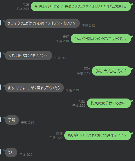 渋々OKの返事に、胸が締め付けられた。「早く済ませて」と付け加えられた言葉が刺さる。でも、ほんの少しでも妻とのつながりを取り戻したい一心で、「ありがとう! 22時半でいい?」と返した。妻の返事は一言。「うん。」(似た葛藤は「セックスレス直前期:手コキかセックスか、40代夫婦の屈辱体験」でも)。